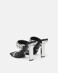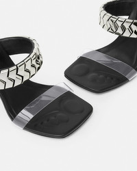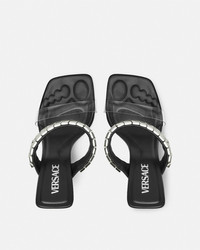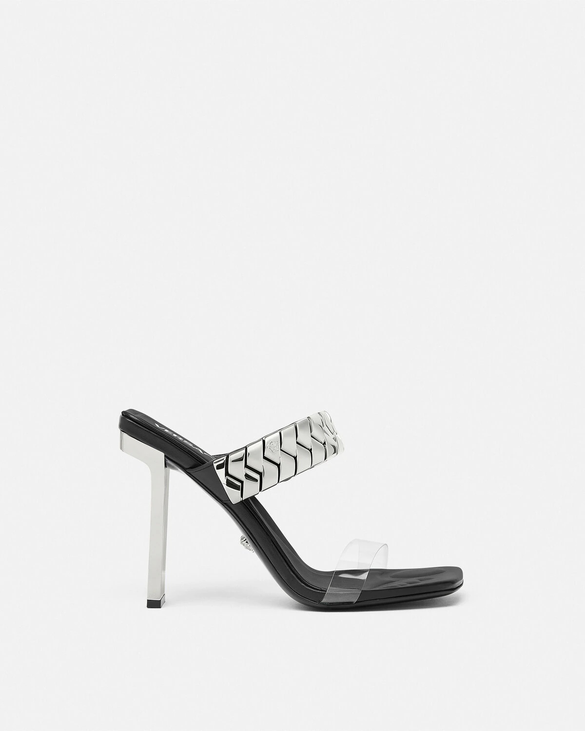 DETAILS These sandals are accented by a metal upper strap and a thin clear strap around the toes The pair is set on slim quared heels with a galvanised finish and the soles have a debossed footprint design for comfort - Medusa hardware - Logo engraving - Slip-on - Square toe - Slim block heel - Outer composition: 100% Polyurethane - Lining 1: 100% Lambskin - Trim: 100% Calf leather - Sole: 100% Calf leather Item: 1017232-1A08651_1B00P SIZE & FIT - The shoe weighs approximately 14 oz / 0.4 kg for the model size 40 IT - Heel: 4.1" / 10.5 cm - Footbed: regular - Fit is small, we recommend taking half a size up