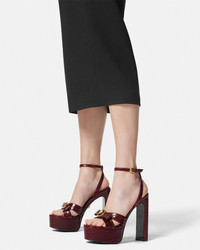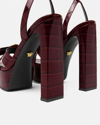 DETAILS These platform sandals are crafted from croceffect embossed leather and are set on highblock heels The upper straps are adorned with the archival Gianni Ribbon bow featuring an enamel Medusa - Medusa hardware - Round open toe - Buckle ankle strap - Slim block heel - Platform - Outer composition: 100% Calf leather - Lining 1: 100% Lambskin - Lining 2: 100% Goat leather - Sole: 100% Calf leather Item: 1017314-1A08910_1R70V&sc_eh=078645e3b372dbc31&sc_lid=704803148&sc_llid=94366&sc_src=email_7428800&sc_uid=TS4tEuGKsN&wt_mc=USA.e-mail.newsletter.mail_20250220.20250220_1816_20250220_Platform-Shoes_W_US.IMAGE%20md_1118844.png SIZE & FIT - The shoe weighs approximately 17.6 oz / 0.5 kg for the model size 39 IT - Heel: 5.5" / 14 cm - Platform: 1.6" / 4 cm - Footbed: regular - Fit is true to size, we recommend taking your normal size