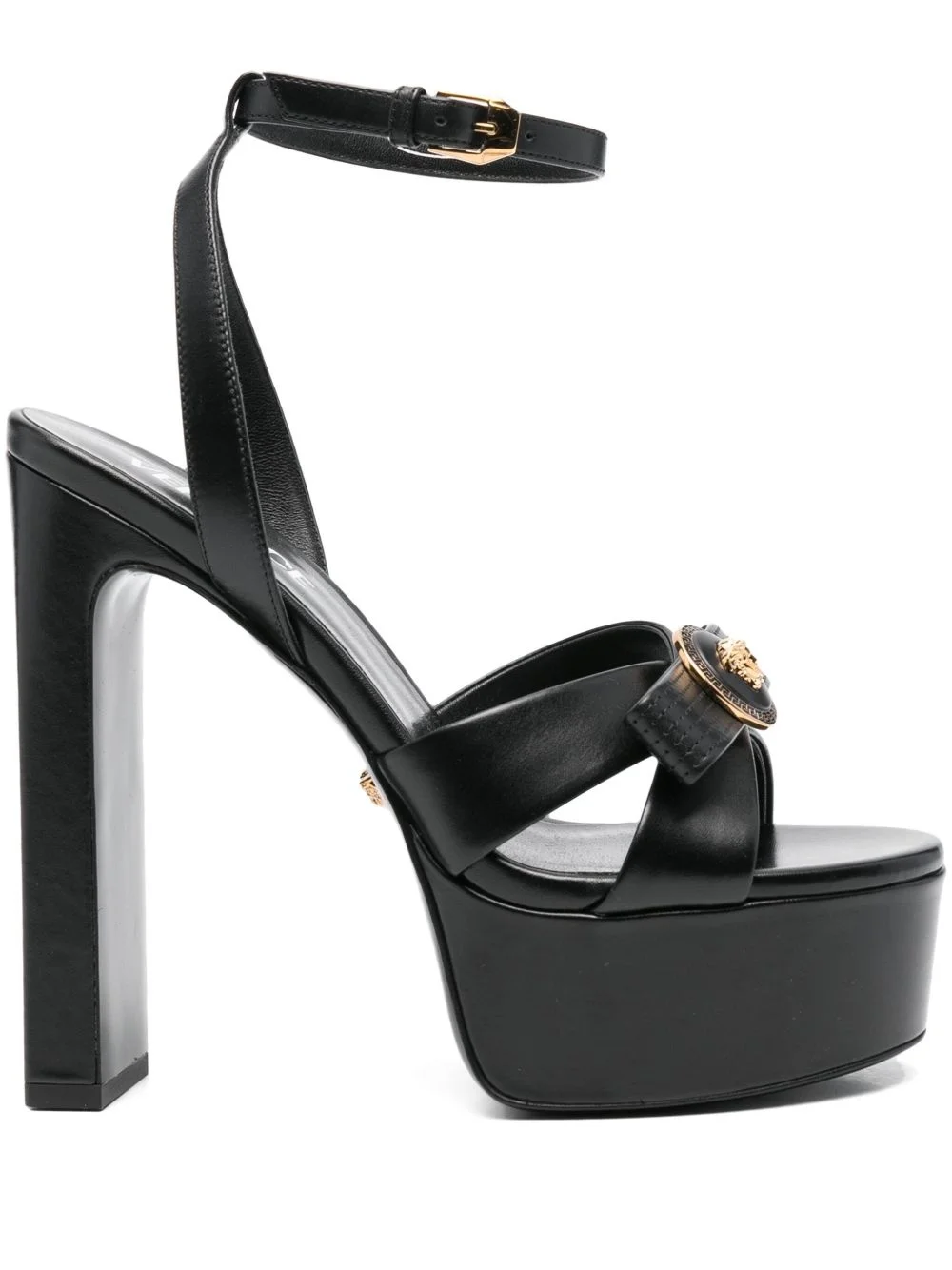 140mm Gianni Ribbon sandals Highlights - Black - Buckle-fastening ankle strap - High block heel - Medusa plaque detail - Flatform sole Made in Italy Composition Sole: Calf Leather 100%, Rubber 100% Outer: Calf Leather 100% Lining: Calf Leather 100% SIZE & FIT Measurement HEEL 5.9 in(15 cm) PLATFORM 1.77 in(4.5 cm)