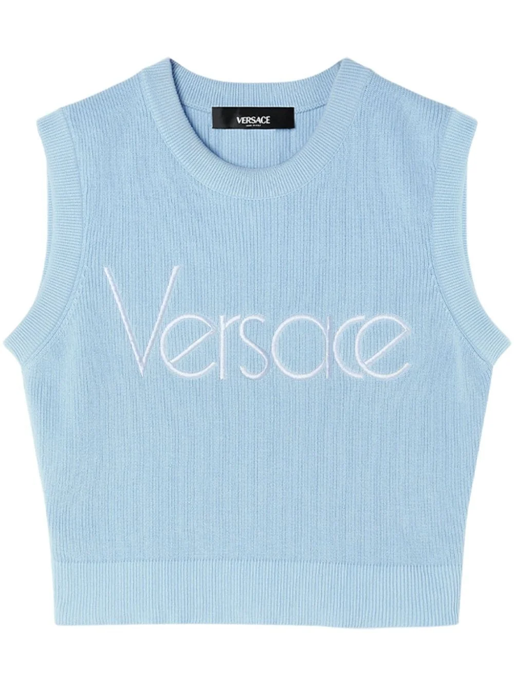 1978 Re-Edition Logo vest Spun from a soft blend of cotton to a finely ribbed knit, this light blue vest looks to Versace's archival motifs. It's embroidered at the front with the house's updated take on its 1978 logo. Highlights - Light blue/white - Cotton blend - Knitted construction - Fine ribbed - Crew neck - Sleeveless - Embroidered logo to the front - Logo patch to the rear - Ribbed trim - Straight hem Made in Italy Composition Cotton 99%, Other fibres 1% Washing instructions Read Manufacturer Guidelines