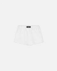 DETAILS These cotton-jersey sweat shorts feature a 1978 Re-Edition Logo in crystal embellishments at the back patch pocket. They're detailed with a jacquard logo label on the elastic waistband. - Versace logo motif - Crystal embellishments - Versace tailoring label - Side pockets - Back patch pocket - Elastic drawstring waistband - Outer composition: 100% Cotton - Lining: 100% Cotton Item: 1015299-1A10622_2W210 SIZE & FIT - The model is 5'8" m tall and wears size 38 IT