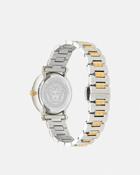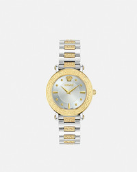 DETAILS The Greca Sphere watch embodies Versace's elegance and sophistication with a sunray dial featuring the House's Medusa and Versace logo at 12 o'clock. The Greca pattern is engraved to the top ring and is incorporated into the metal bracelet links. All Versace watches are guaranteed by the 'Swiss Made' marking. All stainless steel is recycled. - Case: Stainless Steel case - Dial: White Silver dial with Greca on the top ring / Medusa and Versace Logo at 12h - Bracelet: Bicolor (Stainless Steel & IP2N) band with butterfly buckle - Movement: RONDA 762E.2 Swiss Quartz 2-hands movement - Water Resistant: 5 ATM Item: PVE9C005-P0024_RTU_TU_PNUL__ SIZE & FIT - Case: 1.4" / 35 mm