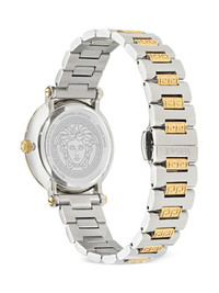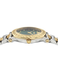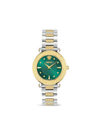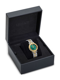 Greca Sphere 35mm Highlights - 35mm - Forest green - Stainless steel - Round face - Signature greca detailing - Index dial - Baton hands - Screw-down crown - Two-tone bracelet - Folding clasp - Quartz movement Imported SIZE & FIT Measurement DIAMETER 1.37 in(3.5 cm)