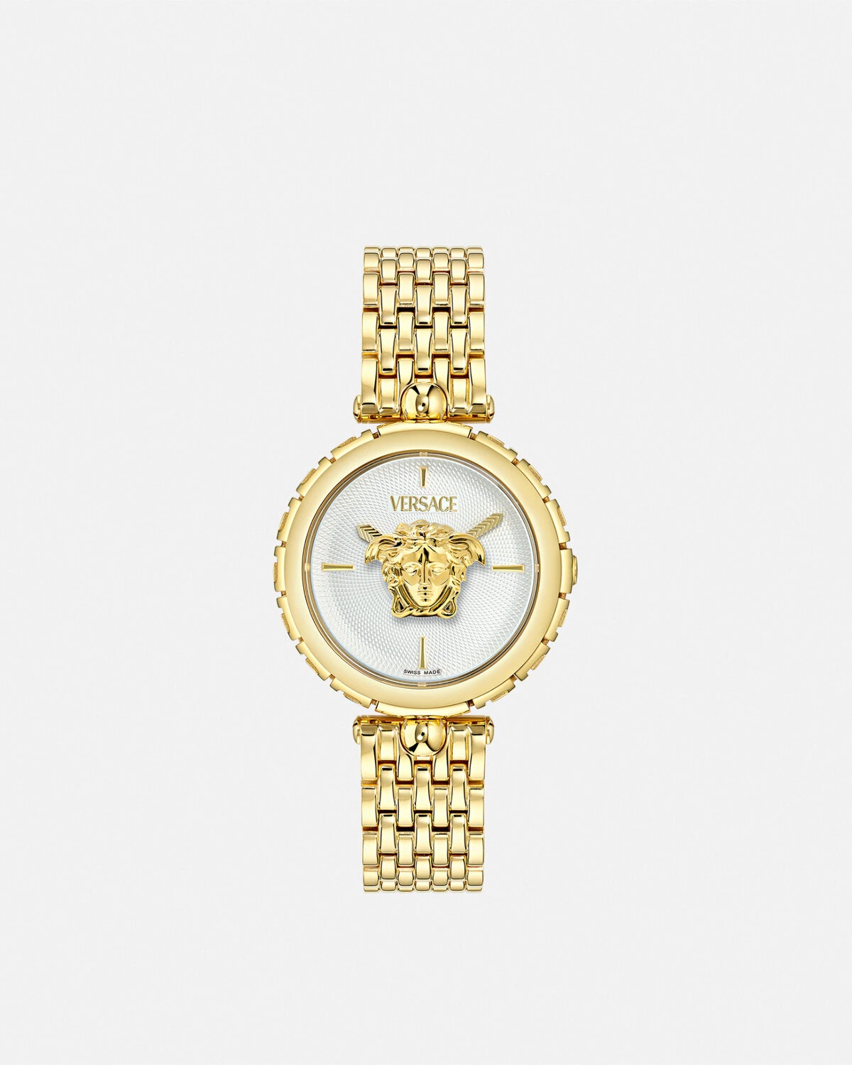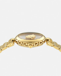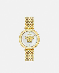 DETAILS This feminine timepiece pays homage to the iconic Medusa through a three-dimensional floating emblem on the dial beneath the Versace logo at 12 o'clock. A structural three-dimensional Greca pattern frames the middle section of the case all around. All Versace watches are guaranteed by the 'Swiss Made' marking. All stainless steel is recycled. - Case: IP2N case - Dial: White Silver dial with floating 3D Medusa and Versace logo at 12h - Bracelet: IP2N band with butterfly buckle - Movement: RONDA 762E.3 Swiss Quartz 2-hands movement - Water Resistant: 5 ATM Item: PVE9D005-P0024_RTU_TU_PNUL__ SIZE & FIT - Case: 1.5" / 38 mm