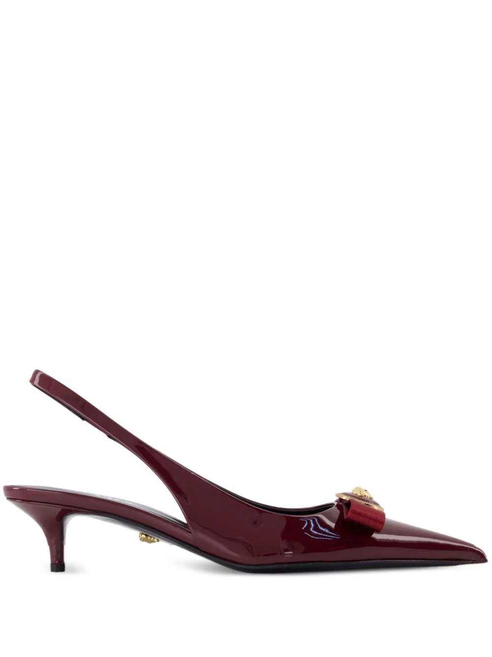 45mm Gianni bow-embellished slingback pumps Highlights - Dark burgundy - Patent leather - Slingback design - Pointed toe - Kitten heel - Medusa head emblem Made in Italy Composition Calf Leather 100% SIZE & FIT Measurement HEEL 1.77 in(4.5 cm)