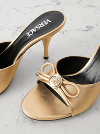 Inspired by all the romance of 'Opera' nights, Versace's mules have been crafted in Italy from gleaming gold leather. They're set on slender stiletto heels and crowned with the house's emblematic 'Medusa' hardware and dainty bows. Size & Fit - Fits true to size, take your normal size - Italian sizing Details & Care - Heel measures approximately 85mm/ 4 inches - Gold leather (Lamb) - Slip on