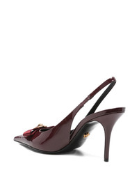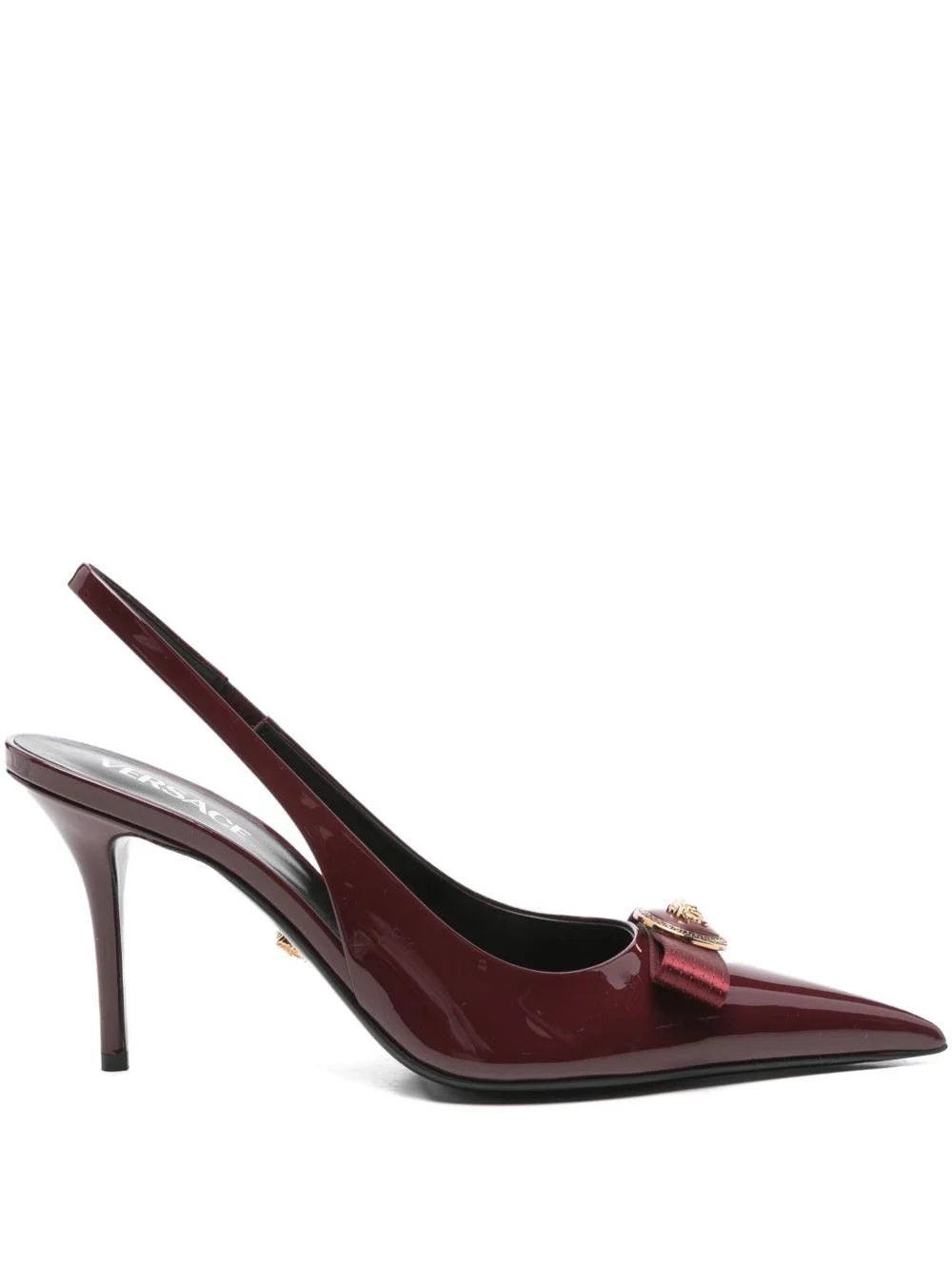 85mm Gianni Ribbon slingback pumps Highlights - Dark burgundy - Pointed toe - Slingback strap - Bow detail - Medusa emblem - Leather upper Made in Italy Composition Lining: Goat Skin 100%, Lamb Skin 100% Outer: Calf Leather 100%, Viscose 64%, Silk 25%, Lamb Skin 11% Sole: Calf Leather 100% SIZE & FIT Measurement HEEL 3.34 in(8.5 cm)