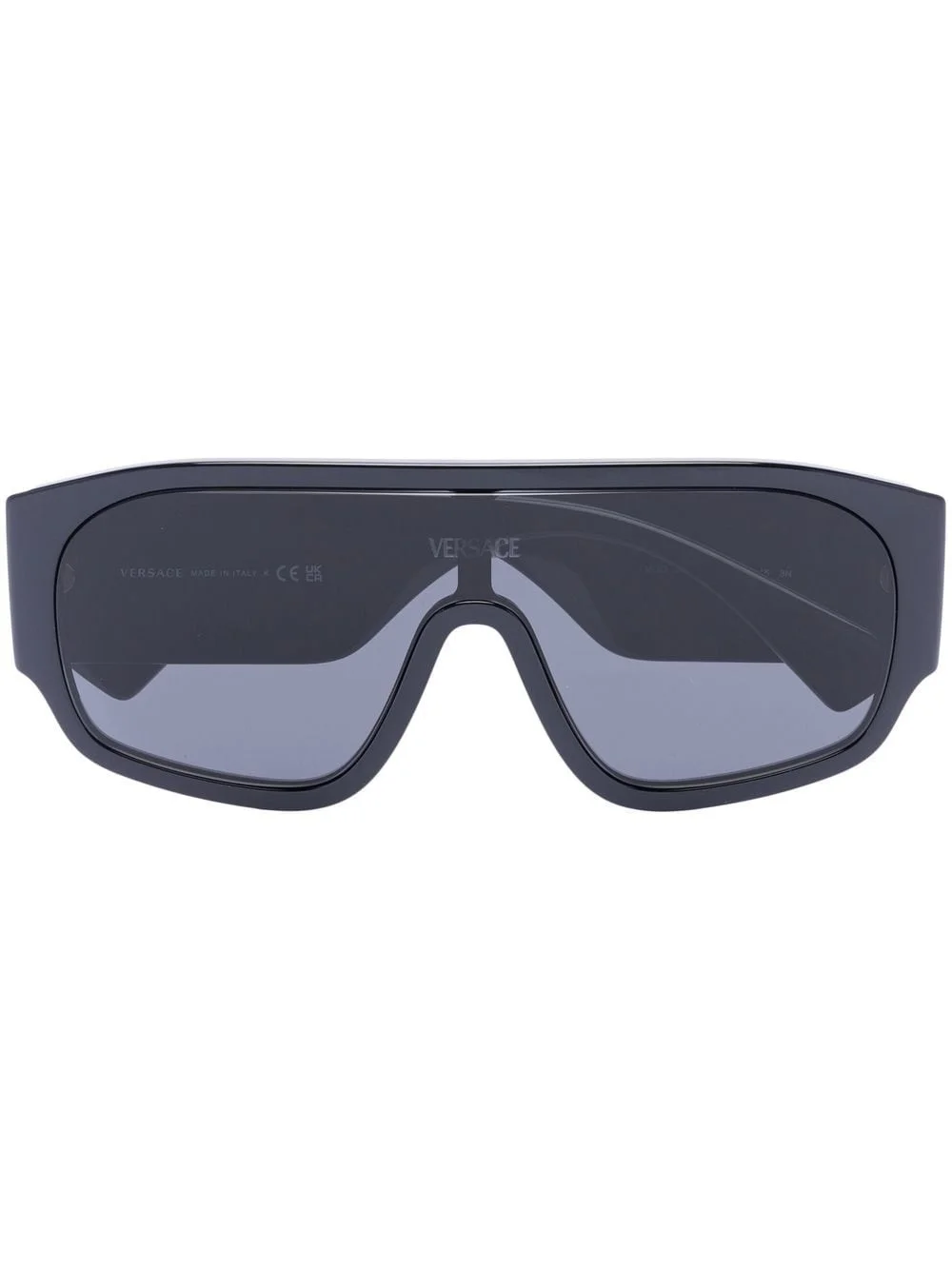 90s Logo-Injected Mask sunglasses black acetate blue tinted lenses gold-tone logo plaque curved tips UV protection These glasses come with a protective case. Made in Italy Composition Acetate 100%, Acrylic 100% SIZE & FIT Measurement Arm Length 5.7 in(14.5 cm) Bridge Width 0.43 in(1.1 cm) Lens Diameter 2.28 in(5.8 cm) Total Width 5.9 in(15 cm)