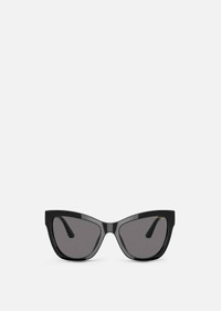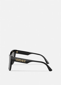 A timeless cat-eye shape, these sunglasses have tortoiseshell acetate frames and a vintage-inspired Versace logo at the temples. DETAILS & CARE - Cat-eye shaped lens - Frame colour: Black - Temple colour: Black - Details: '90's vintage metal logo on the temples - Lens colour: Dark Grey - Frame: Acetate - Temple: Injected - Can be adapted to prescription lenses - Made in Italy SIZE & FIT - Eye size: 56 - Bridge: 19 - Temple: 140
