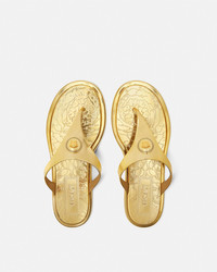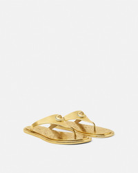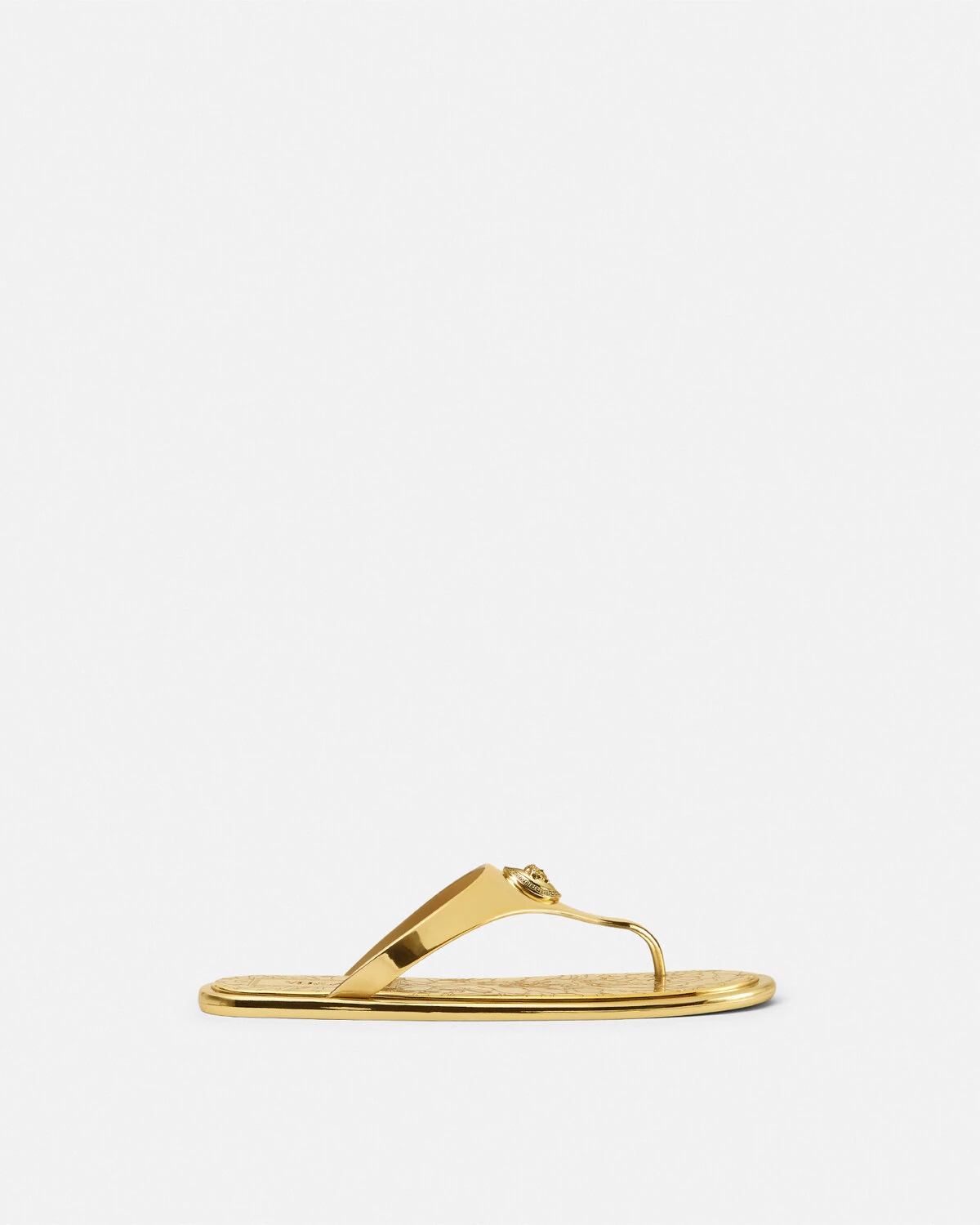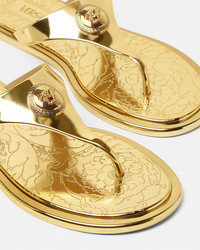 DETAILS These metallic laminated Alia flat sandals feature an engraved Barocco pattern and 90s Vintage Logo on the insoles and a central Medusa hardware - Medusa hardware - '90s Vintage Logo motif - Barocco motif - T-bar - Outer composition: 100% Thermoplastic polyurethane - Sole: 100% Thermoplastic polyurethane Item: 1016248-1A14478_1X00V SIZE & FIT - The shoe weighs approximately 10.6 oz / 0.3 kg for the model size 39 IT