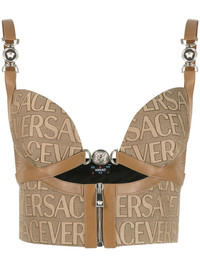 Versace Allover bustier top Versace boasts an all-over logo print in this corset-style crop top, embellished with Medusa plaque detailing to create a modern, branding-focused finish. Highlights - Earth brown - Leather trim - All-over logo print - Medusa plaque detail - Corset style - Sleeveless - Cut-out detailing - Cropped - Front zip fastening Made in Italy Composition Lining: Cupro 100%, Cotton 40% Outer: Calf Leather 100%, Polyester 60% SIZE & FIT Model measurements Height 5 ft 10 in(1.78 m) Bust/Chest 30.7 in(78 cm) Hips 34.64 in(88 cm) Waist 23.22 in(59 cm) Measurement LENGTH 14.17 in(36 cm) BUST 34.64 in(88 cm) FittingInformation Designed for a close fit throughout Cropped in length Made from a lightweight non-stretch fabric This piece fits true to size – take your usual size Washing instructions Dry Clean Only