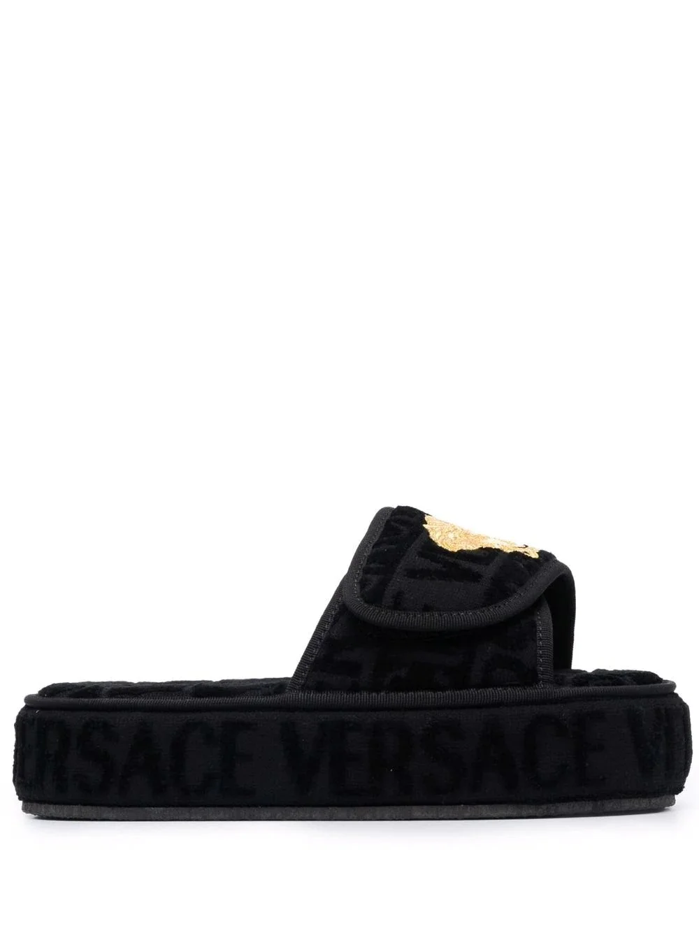 Versace Allover slippers Highlights - Black - Medusa head motif - All-over embossed logo print - Open toe - Front touch-strap fastening - Platform sole Made in Italy Composition Sole: Rubber 100% Outer: Fabric 100% Lining: Fabric 100%