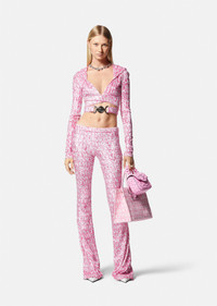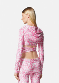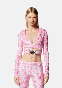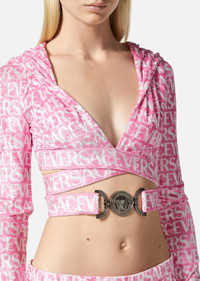 In a soft textured velvet, this cropped long-sleeved hoodie features a Versace Allover logo print. A crisscross Medusa Biggie belt strap accents the runway piece with a plunging neckline. Worn with matching trousers, the style creates a Very Versace ensemble. DETAILS & CARE - Versace Allover print - Medusa Biggie hardware - Long sleeves - Crewneck - Crisscross belt - Outer composition: 92% Polyester, 8% Elastane - Hand wash gently using mild detergent - Do not bleach - Do not tumble dry - Dry flat - Do not iron - Do not dry clean SIZE & FIT - The model is 1,75 m tall and wears size 38 IT - All sizes fit Italian standards