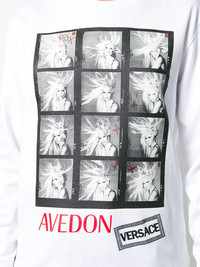Avedon photo print T-shirt Strike-a-pose. Depicting the iconic portrait of Donatella Versace taken by photographer Richard Avedon, this white cotton sweatshirt from Versace with black and white photo booth style pics oozes old-school glamour. Click click. Featuring a round neck, long sleeves and an embroidered logo to the front. Made in Italy Composition Cotton 100% SIZE & FIT FittingInformation This piece fits true to size. We recommend you get your regular size Cut for a relaxed fit Washing instructions Hand Wash