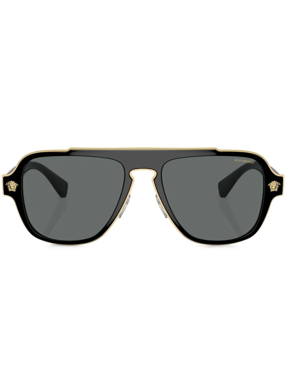 aviator-frame sunglasses These Versace Eyewear Medusa aviator sunglasses are defined by their vintage-style aviator frame. With striking blue lenses, this pair is elevated by the Medusa head detail and the gold-tone trims. Highlights - Black - Medusa-head motif - Gold-tone trim - Aviator frame - Blue tinted lenses - Uv-protective lenses - Logo plaque at the arm - Straight arms - Curved tips - These glasses come with a protective case. Made in Italy Composition Outer: Metal 100% SIZE & FIT Measurement Bridge Width 0.7 in(1.8 cm) Lens Diameter 2.2 in(5.6 cm) Arm Length 5.7 in(14.5 cm)