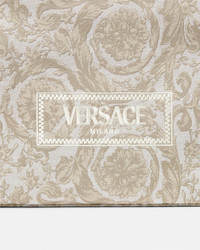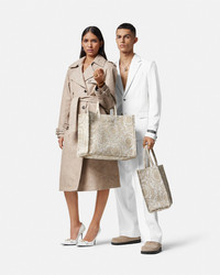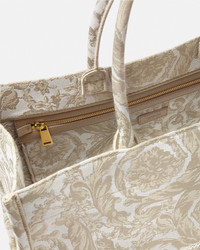 DETAILS This large canvas tote bag features a tonal jacquard Barocco pattern throughout, tubular top handles, and Versace's signature '90s Vintage Logo embroidery. - Barocco pattern - '90s Vintage Logo embroidery - Top handles - Internal zipped pocket - Outer composition: 53% Nylon, 38% Cotton, 6% Polyester, 3% Acrylic - Fabric made using GRS-certified recycled nylon - Trim: 100% Calf leather - Leather from tanneries certified to high levels of environmental performance Item: 1013152-1A09741_DTU_UNICA_2KF4V__ SIZE & FIT - L17.3 x W6.6 x H13.8" - Drop: L7.5" - Weight: 17.9 oz