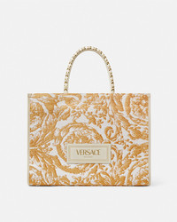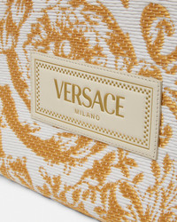DETAILS A spacious tote bag woven from raffia in the Barocco pattern featuring a leather Versace 90s Vintage Logoembossed tag at the front The bag is complete with tubular whipstitched top handles and has a detachable crossbody strap for multiple carry options - Barocco pattern - '90s Vintage Logo patch - Top handles - Interior zip pocket - Detachable and adjustable shoulder strap - Leather feet - Outer composition: 70% Viscose, 16% Polyester, 14% Cotton - Lining: 100% Cotton - Trim: 100% Calf leather Item: 1011562-1A11311_2W11V SIZE & FIT - L11.4 x W6.1 x H11.8" / L39 x W15.5 x H30 cm - Strap: L34.2-57.9" / L87-147 cm - Strap drop: L16.5-28.3" / L42-72 cm - Handle drop: 5.7" / 14.5 cm - Approximate weight: 42.3 oz / 1.2 kg
