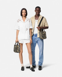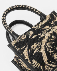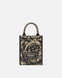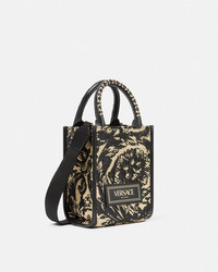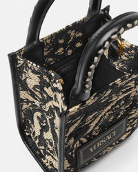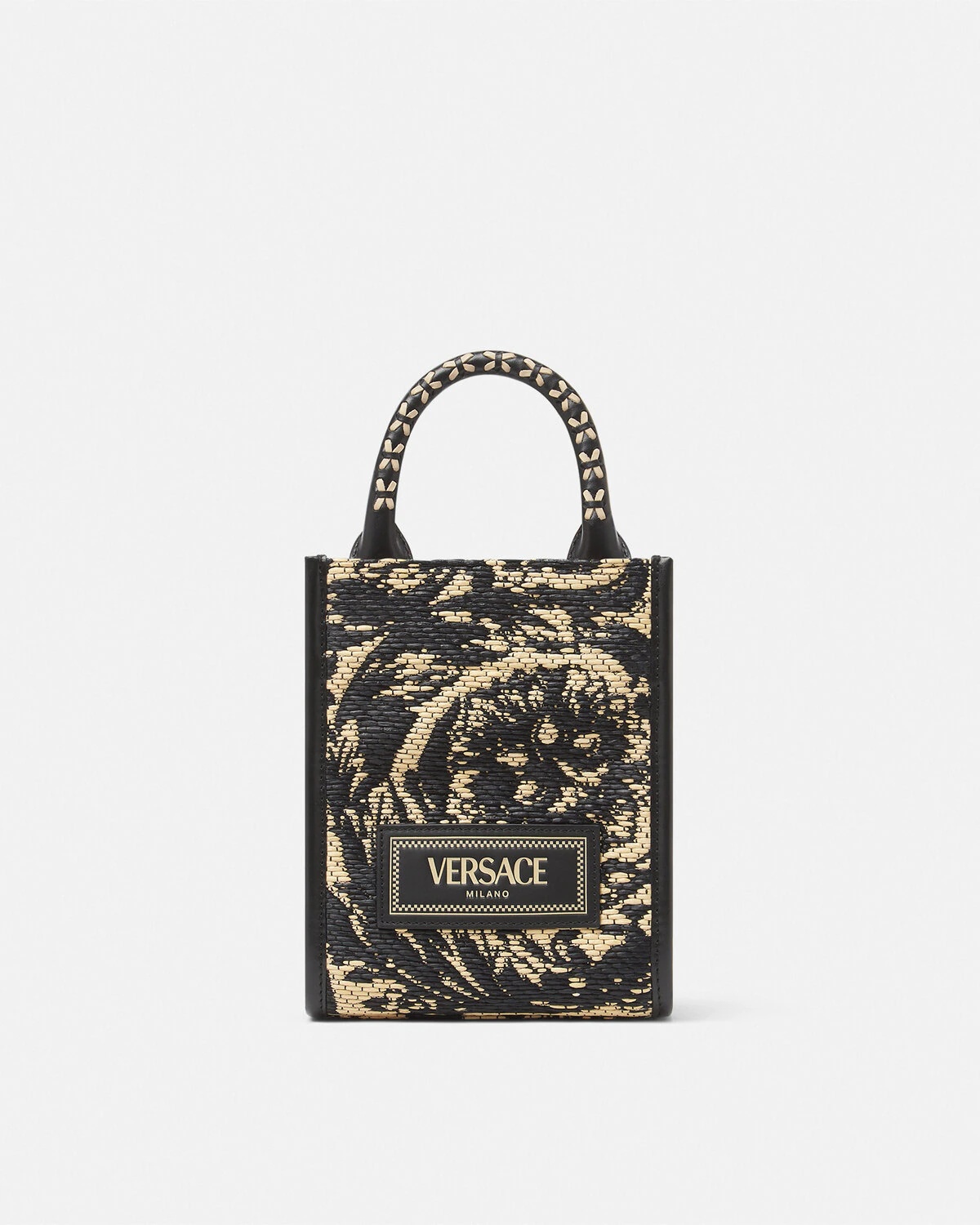 DETAILS This mini tote bag is woven from raffia detailed with whip-stitched leather tubular handles, and an embossed leather Versace '90s Vintage Logo tag at the front. The accessory is complete with a detachable crossbody strap for multiple carry options. - Barocco pattern - '90s Vintage Logo patch - Top handles - Detachable and adjustable shoulder strap - Leather feet - Outer composition: 66% Viscose, 20% Polyester, 14% Cotton - Lining: 100% Cotton - Trim: 100% Calf leather Item: 1011565-1A11311_DTU_UNICA_6X60V__ SIZE & FIT - L6.7 x W4.3 x H8.3" - Strap: L86-146 cm - Strap drop: 17.3-28.3" - Handle drop: 3.5" - Approximate weight: 17.6 oz