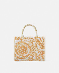 DETAILS This small tote bag is woven from raffia in the Barocco pattern featuring a leather Versace 90s Vintage Logoembossed tag at the front Its complete with tubular whipstitched leather handles and a detachable crossbody strap for multiple carry options - Barocco pattern - '90s Vintage Logo patch - Top handles - Interior zip pocket - Detachable and adjustable shoulder strap - Leather feet - Outer composition: 70% Viscose, 16% Polyester, 14% Cotton - Lining: 100% Cotton - Trim: 100% Calf leather Item: 1011564-1A11311_2W11V SIZE & FIT - L11.2 x W5.1 x H8.7" / L28.5 x W13 x H22 cm - Strap: L32.7-56.3" / L83-143 cm - Strap drop: L16.5-28.3" / L42-72 cm - Handle drop: L3.9" / L10 cm - Approximate weight: 28.2 oz / 0.8 kg