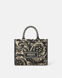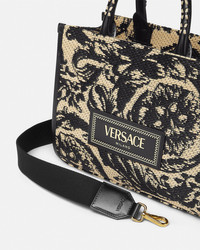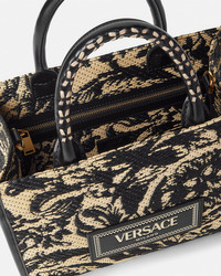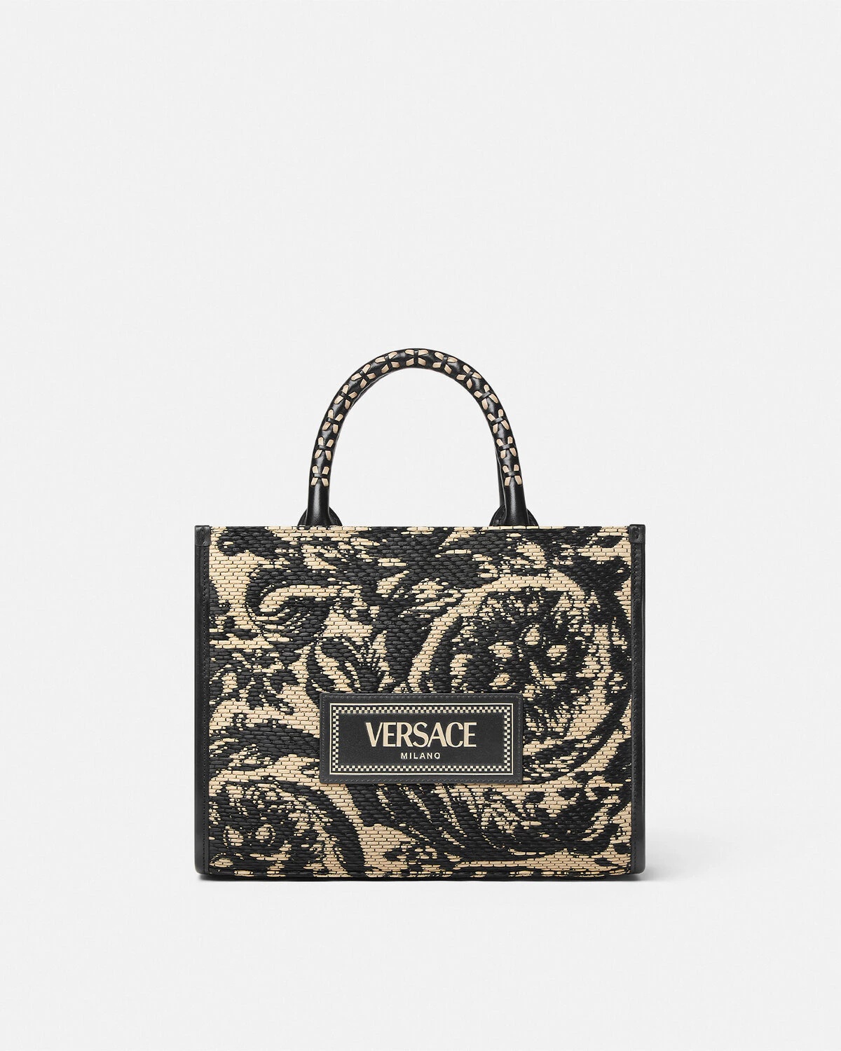 DETAILS This small tote bag is woven from raffia in the Barocco pattern, featuring a leather Versace '90s Vintage Logo-embossed tag at the front. It's complete with tubular whip-stitched leather handles and a detachable crossbody strap for multiple carry options. - Barocco pattern - '90s Vintage Logo patch - Top handles - Interior zip pocket - Detachable and adjustable shoulder strap - Leather feet - Outer composition: 70% Viscose, 16% Polyester, 14% Cotton - Lining: 100% Cotton - Trim: 100% Calf leather Item: 1011564-1A11311_DTU_UNICA_6X60V__ SIZE & FIT - L11.2 x W5.1 x H8.7" - Strap: L83-143 cm - Strap drop: L16.5-28.3" - Handle drop: 3.9" - Approximate weight: 28 oz
