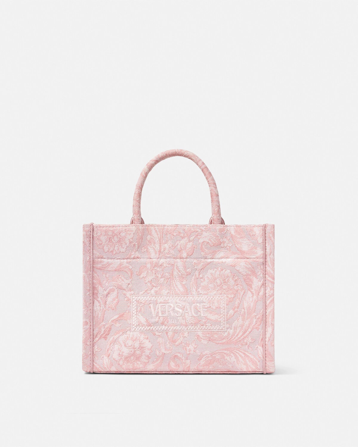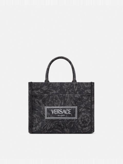 DETAILS This small tote bag is crafted from jacquard Barocco canvas and features rigid top handles and a detachable crossbody strap that allows for multiple carry options. The spacious design is finished with a '90s Vintage Logo Versace embroidery. - Barocco pattern - '90s Vintage Logo embroidery - Top handles - Detachable and adjustable shoulder strap - Internal zipped pocket - Outer composition: 53% Nylon, 38% Cotton, 6% Polyester, 3% Acrylic - Fabric made using GRS-certified recycled nylon - Trim: 100% Calf leather - Leather from tanneries certified to high levels of environmental performance Item: 1011564-1A09741_DTU_UNICA_2PQ2V__ SIZE & FIT - L11.2 x W5.1 x H8.7" - Strap: L32.3"-53.9" - Strap drop: 15.7"-26.6" - Handle drop: 4.5" - Approximate weight: 24.7 oz