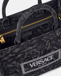DETAILS This small tote bag is crafted from jacquard Barocco canvas and features rigid top handles and a detachable crossbody strap that allows for multiple carry options. The spacious design is finished with a '90s Vintage Logo Versace embroidery. - Barocco pattern - '90s Vintage Logo embroidery - Top handles - Detachable and adjustable shoulder strap - Internal zipped pocket - Outer composition: 53% Nylon, 38% Cotton, 6% Polyester, 3% Acrylic - Fabric made using GRS-certified recycled nylon - Trim: 100% Calf leather - Leather from tanneries certified to high levels of environmental performance Item: 1011564-1A09741_DTU_UNICA_2BM0V__ SIZE & FIT - L11.2 x W5.1 x H8.7" - Strap: L32.3"-53.9" - Strap drop: 15.7"-26.6" - Handle drop: 4.5" - Approximate weight: 24.7 oz
