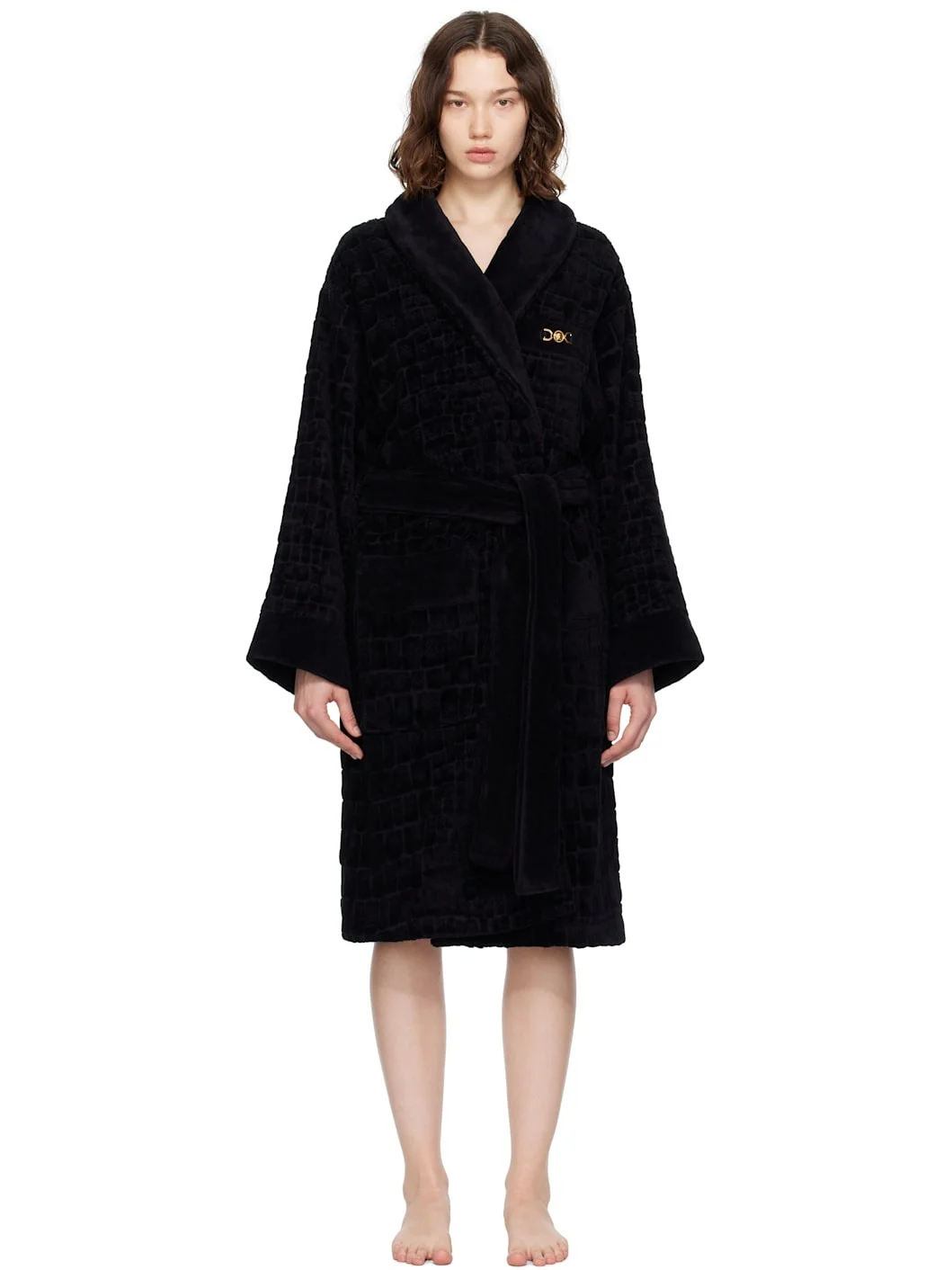 Cotton terrycloth bathrobe. Jacquard graphic pattern throughout. · Shawl collar · Belt loops and detachable self-tie belt · Medusa hardware at chest · Patch pockets · Logo embroidered at back Supplier color: Black Body: 100% cotton. Trim 1: 68% polyester, 32% metallized polyester. Trim 2: 100% cotton. Made in Italy 252404F077001