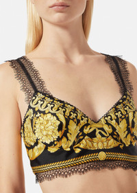 A very Versace silhouette is crafted from pure silk, the bralette top featuring the Barocco print. The feminine design is embellished with a delicate Chantilly lace trim. DETAILS & CARE - Barocco print - Chantilly lace shoulder straps and trim - Elastic band on reverse - Outer fabric: 100% Silk - Lining: 75% Acetate 25% Silk - Trim: 80% Polyamide 20% Elastane - Cool iron - Delicate dry clean - Do not bleach - Do not tumble dry - Do not wash SIZE & FIT - All sizes fit Italian standards