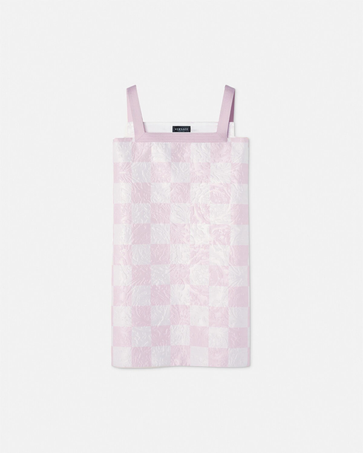 DETAILS This shift mini dress is crafted from double silk duchesse with a jacquard checkerboard pattern and tonal Barocco-embossed surface. A top-stitched 'nastro Gianni' trim frames the square neckline, accented by Medusa snap-buttons at the back shoulder straps. - Contrasto pattern - Barocco motif - Medusa hardware - Sleeveless - Square neckline - Snap-button closures - Side zip closure - Outer composition: 65% Polyester, 35% Silk - Lining: 74% Viscose, 26% Polyester - Trim: 65% Polyester, 35% Silk Item: 1015005-1A10692_2PQ50 SIZE & FIT - The model is 1,80 m tall and wears size 38 - All sizes fit Italian standards