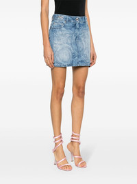 baroque-print denim miniskirt Versace founder Gianni was inspired by the floor of ruins in Reggio Calabria, a place the designer frequented as a child, when creating the now iconic Medusa motif. Crafted from light blue denim with a distinctive baroque-print, this mini skirt features the emblem in a silver-tone plaque detail at the waist. Highlights - Indigo blue - Cotton - Washed denim - Baroque-pattern print - Logo patch to the rear - High-waisted - Signature medusa head buttons - Front button and zip fastening - Classic five pockets - Straight hem - Above-knee length Made in Italy Composition Lining: Polyester 65%, Cotton 35% Outer: Cotton 100%, Calf Leather 100% SIZE & FIT Model measurements Height 5 ft 9 in(1.76 m) Bust/Chest 31.88 in(81 cm) Hips 35.43 in(90 cm) Waist 24.8 in(63 cm) FittingInformation This mini-length skirt is intended to be worn just below the waist Sturdy and hard-wearing, this denim piece offers no stretch This piece fits true to size – take your usual size Washing instructions Machine Wash