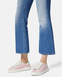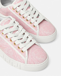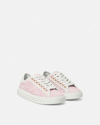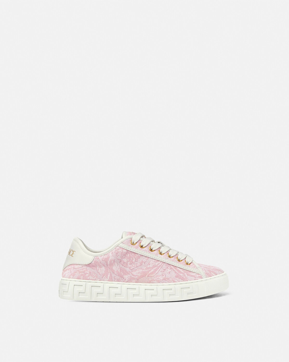 DETAILS The low-top silhouette is characterized by an engraved Greca pattern on vulcanized soles, featuring jacquard Barocco uppers. A back logo stamp accents the lace-up style. These Greca sneakers have a 38% Responsible Input and are 100% animal-free. New season Greca sneakers are made using responsible materials with certified recycled content and/or are derived from renewable origin. - Barocco pattern - Low top - Lace up - Logo patch on tongue - Logo on heel counter - Outer composition: 54% Nylon, 39% Cotton, 7% Polyester - Trim: 100% Polyester - Toe cap and counter partially made of recycled cotton: derived from pre and post-consumer recycled cotton fibers. - Lining: 100% Polyester and PU coating - Lining made of Freebio™ rPU: derived from recycled pre-consumer polyurethane, recycled post-consumer PET bottles, calcium carbonate, and wood fibers. - Sole: 100% Thermoplastic polyurethane - Sole partially made of recycled TPU: derived from pre-consumer factory scraps generated from other outsole productions. - Padding partially made of bio-based PU: derived from corn starch. - Strobel partially made of recycled PET: derived from post-consumer recycled PET bottles. - Insole footbed made from Biomass balance PU: derived from municipal waste methane. Item: 1013568-1A09449_2PP9C SIZE & FIT - The shoe weighs approximately 14.1 oz for the model size 37 IT