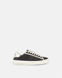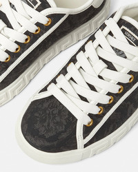 DETAILS The low-top silhouette is characterized by an engraved Greca pattern on vulcanized soles, featuring jacquard Barocco uppers. A back logo stamp accents the lace-up style. These Greca sneakers have a 38% Responsible Input and are 100% animal-free. New season Greca sneakers are made using responsible materials with certified recycled content and/or are derived from renewable origin. - Barocco pattern - Low top - Lace up - Logo patch on tongue - Logo on heel counter - Outer composition: 54% Nylon, 39% Cotton, 7% Polyester - Trim: 100% Polyester - Toe cap and counter partially made of recycled cotton: derived from pre and post-consumer recycled cotton fibers. - Lining: 100% Polyester and PU coating - Lining made of Freebio™ rPU: derived from recycled pre-consumer polyurethane, recycled post-consumer PET bottles, calcium carbonate, and wood fibers. - Sole: 100% Thermoplastic polyurethane - Sole partially made of recycled TPU: derived from pre-consumer factory scraps generated from other outsole productions. - Padding partially made of bio-based PU: derived from corn starch. - Strobel partially made of recycled PET: derived from post-consumer recycled PET bottles. - Insole footbed made from Biomass balance PU: derived from municipal waste methane. Item: 1013568-1A09449_2BE4C SIZE & FIT - The shoe weighs approximately 14.1 oz for the model size 37 IT