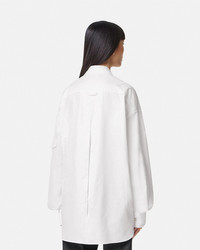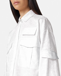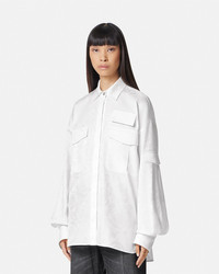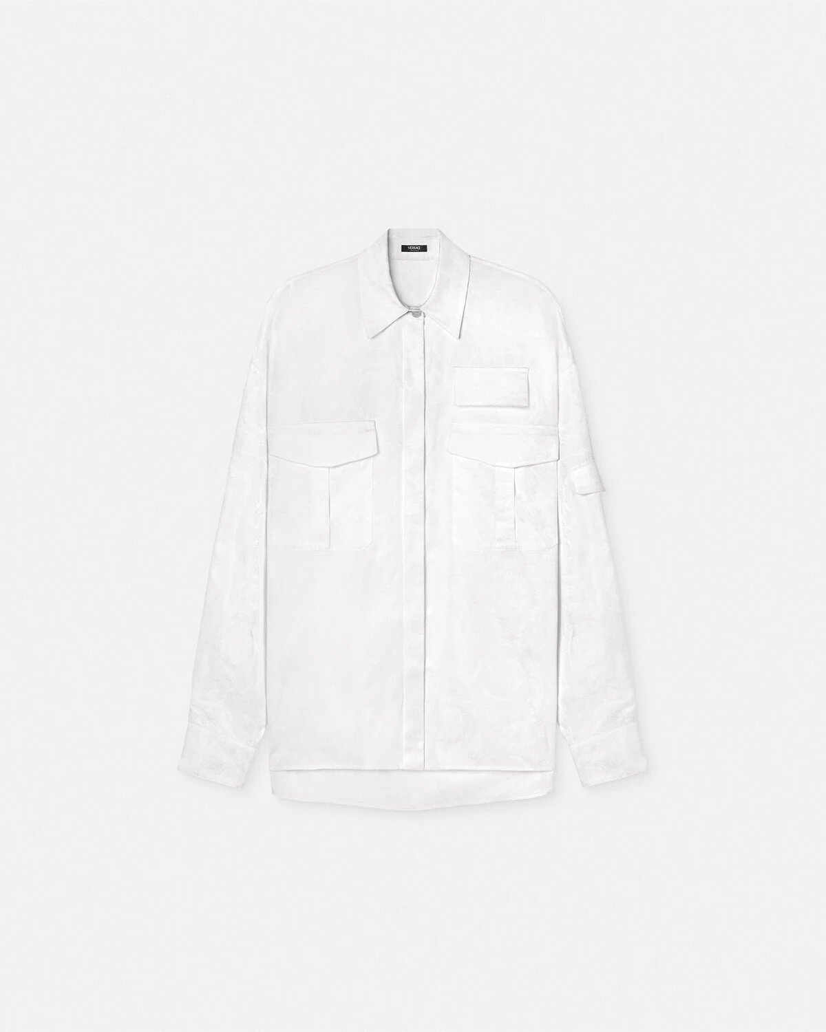 DETAILS An oversized long-sleeved cotton shirt featuring a tonal Barocco jacquard pattern throughout with large cargo patch pockets. A single Medusa button accents the top button-down closure. - Barocco pattern - Medusa hardware - Long sleeves - Pointed collar - Patch flap pockets - Buttoned cuffs - Outer composition: 100% Cotton Item: 1013694-1A09630_1W000 SIZE & FIT - The model is 5'10" tall and wears size 38 IT