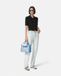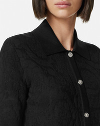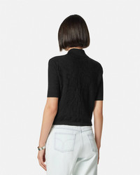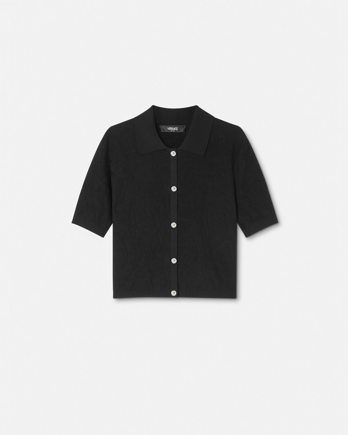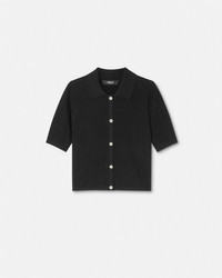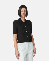 DETAILS A tonal jacquard-knit silk and cotton blend button-down cardigan with accent Medusa hardware and a ribbed pointed collar. - Medusa hardware - Short sleeves - Pointed collar - Ribbed trims - Outer composition: 57% Silk, 43% Cotton Item: 1014279-1A09457_1B000 SIZE & FIT - The model is 5'10" tall and wears size 38 IT
