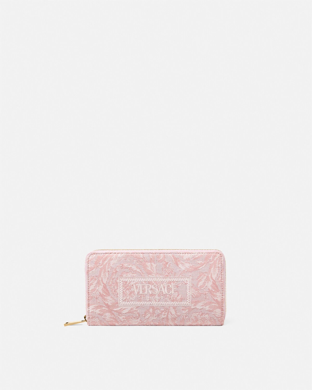 DETAILS This long continental wallet features a tonal canvas jacquard Barocco pattern and an embroidered Versace '90s Vintage Logo at the front. - Barocco pattern - '90s Vintage Logo embroidery - Zip around closure - Two note compartments - Zipped coin pocket - 12 card compartments - Outer composition: 54% Nylon, 39% Cotton, 7% Polyester - Lining: 60% Cotton, 40% Viscose - Trim: 100% Calf leather Item: DPDI056-1A09741_DTU_UNICA_2PQ2V__ SIZE & FIT - L7.9" x W0.9" x H4.3" - Weight: 8.6 oz