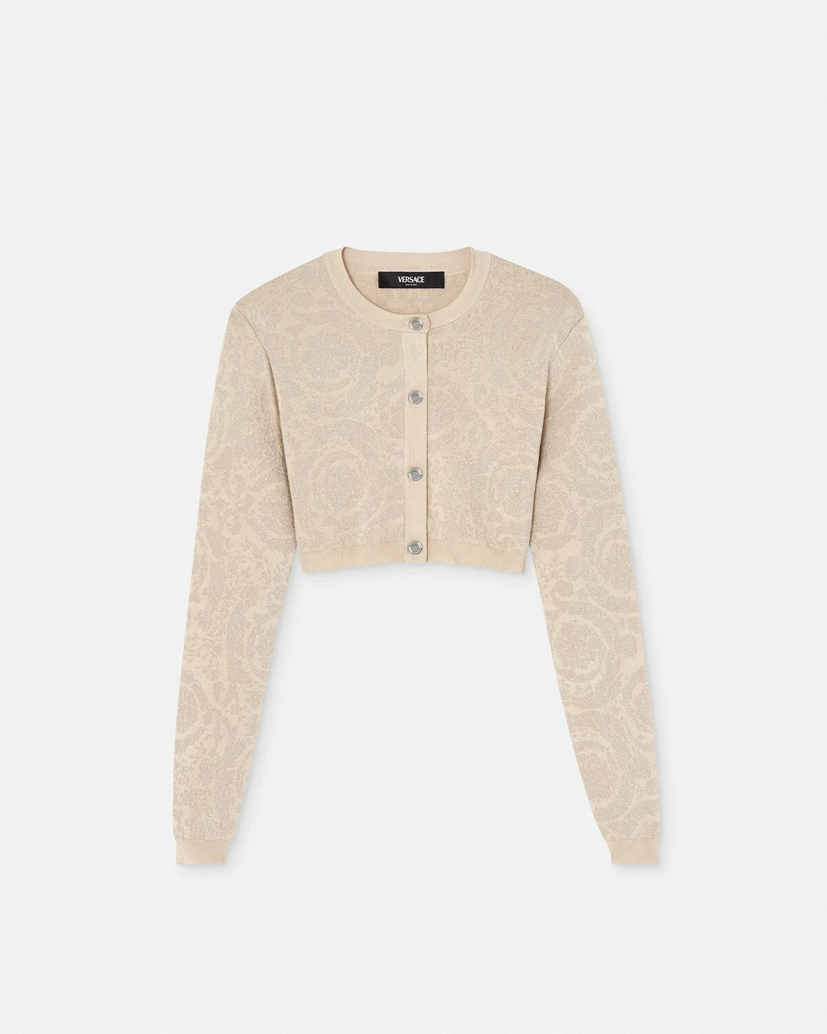 DETAILS Cropped knit cardigan featuring a lurex Barocco pattern, accented by Medusa hardware. - Medusa hardware - Long sleeves - Crewneck - Front button closure - Ribbed trims - Outer composition: 84% Viscose, 7% Nylon, 6% Metallized Polyester, 3% Elastane Item: 1011020-1A10004_1KD70 SIZE & FIT - The model is 1,77 m tall and wears size 38 IT