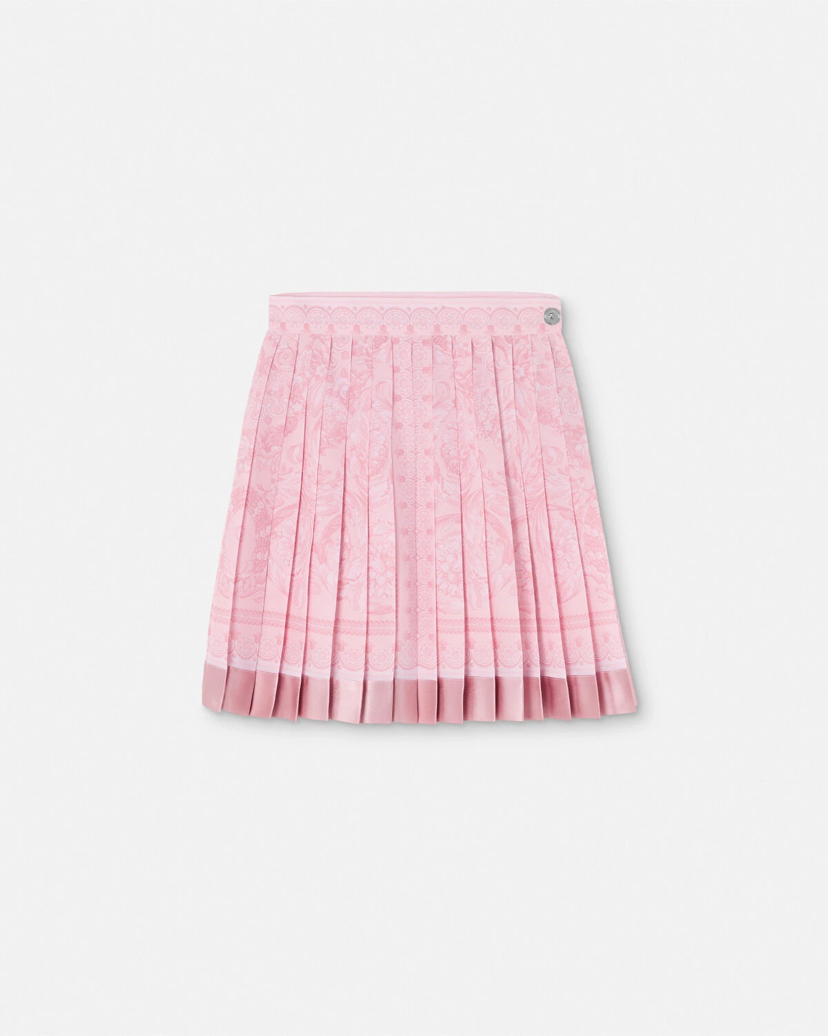 DETAILS This pleated mini skirt is made from crêpe de chine silk in a tonal pastel Barocco print. A single Medusa snap-button accents the style. - Barocco print - Medusa hardware - Side zip closure - Snap button closure - Outer composition: 100% Silk - Trim: 100% Silk Item: 1000829-1A10053_5P950 SIZE & FIT - The model is 5'10" tall and wears size 38 IT