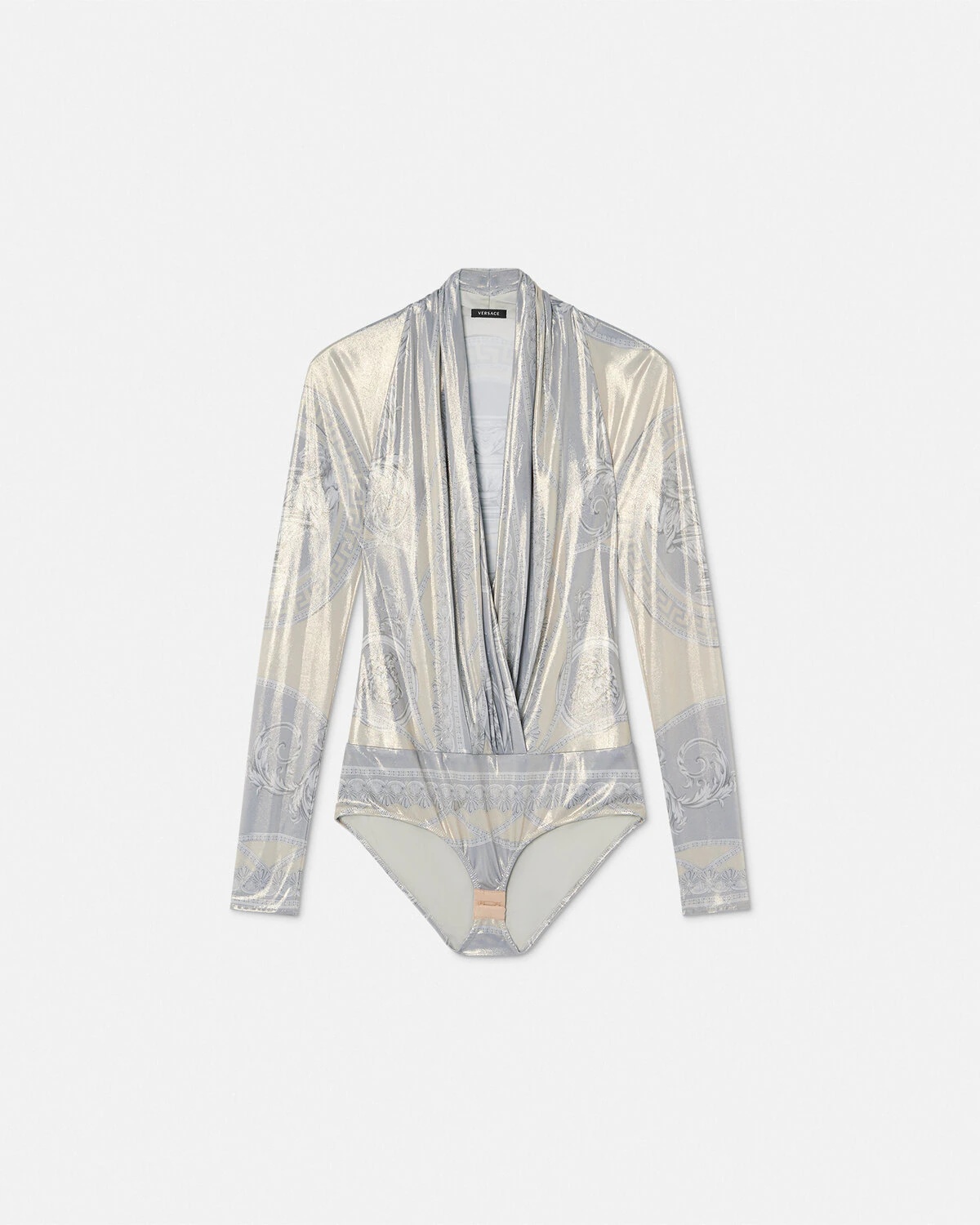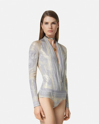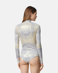 DETAILS This longsleeved bodysuit features the classical La Coupe des Dieux print in laminated liquid jersey with a plunging draped neckline - La Coupe des Dieux print - Long sleeves - V-neckline - Hook and eye closure - Outer composition: 100% Viscose - Lining: 100% Viscose Item: 1005321-1A13546_5E450 SIZE & FIT - The model is 5'10" / 1.79 m tall and wears size 38 IT