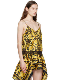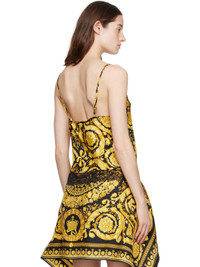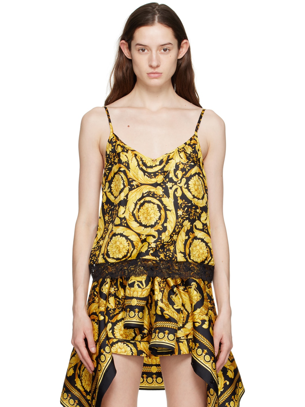 Silk twill tank top. Barocco pattern printed throughout. · Medusa hardware at V-neck · Lace trim at hem · Adjustable spaghetti straps Supplier color: Black/Gold