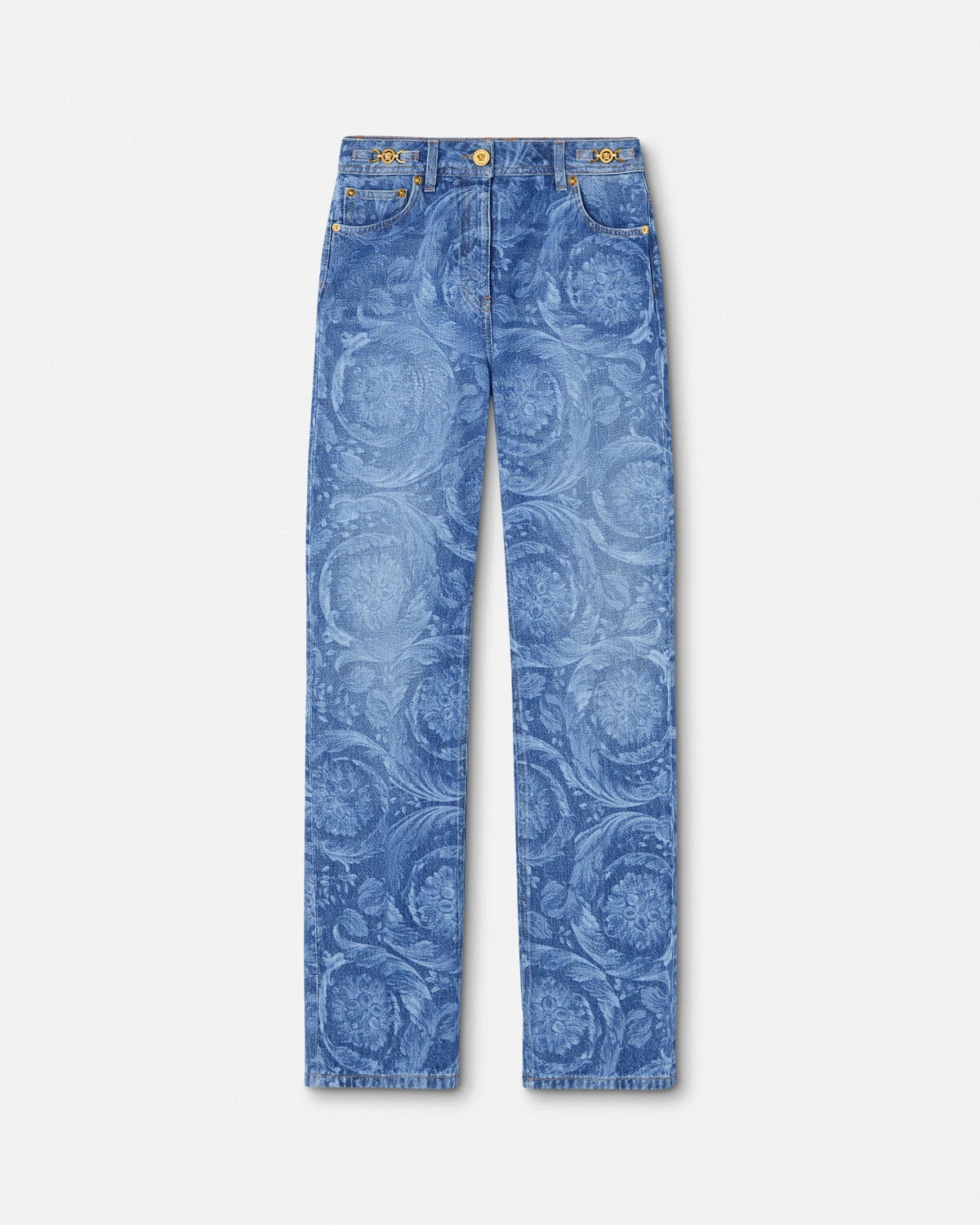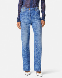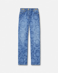 DETAILS Regular, straight-fit jeans featuring a lasered Barocco pattern throughout and accent Medusa '95 hardware. - Barocco pattern - Belt loops - Five-pocket design - Back leather logo patch - Outer composition: 100% Cotton - Lining: 65% Polyester, 35% Cotton - Trim: 100% Calf leather Item: 1011519-1A10029_1D030 SIZE & FIT - The model is 5'10" tall and wears size 27 IT