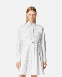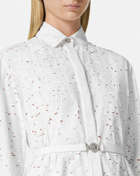 DETAILS This long-sleeved button-down shirt dress is made from poplin cotton featuring a Sangallo Barocco embroidery with a tonal rubber texture. A detachable Medusa '95 clic-clac belt accentuates the waist. - Barocco embroidery - Medusa '95 hardware - Long sleeves - Pointed collar - Concealed button placket - Buttoned cuffs - Outer composition: 100% Cotton - Lining: 100% Silk - Trim: 100% Cotton Item: 1013211-1A09632_1W000 SIZE & FIT - The model is 5'8" tall and wears size 38 IT