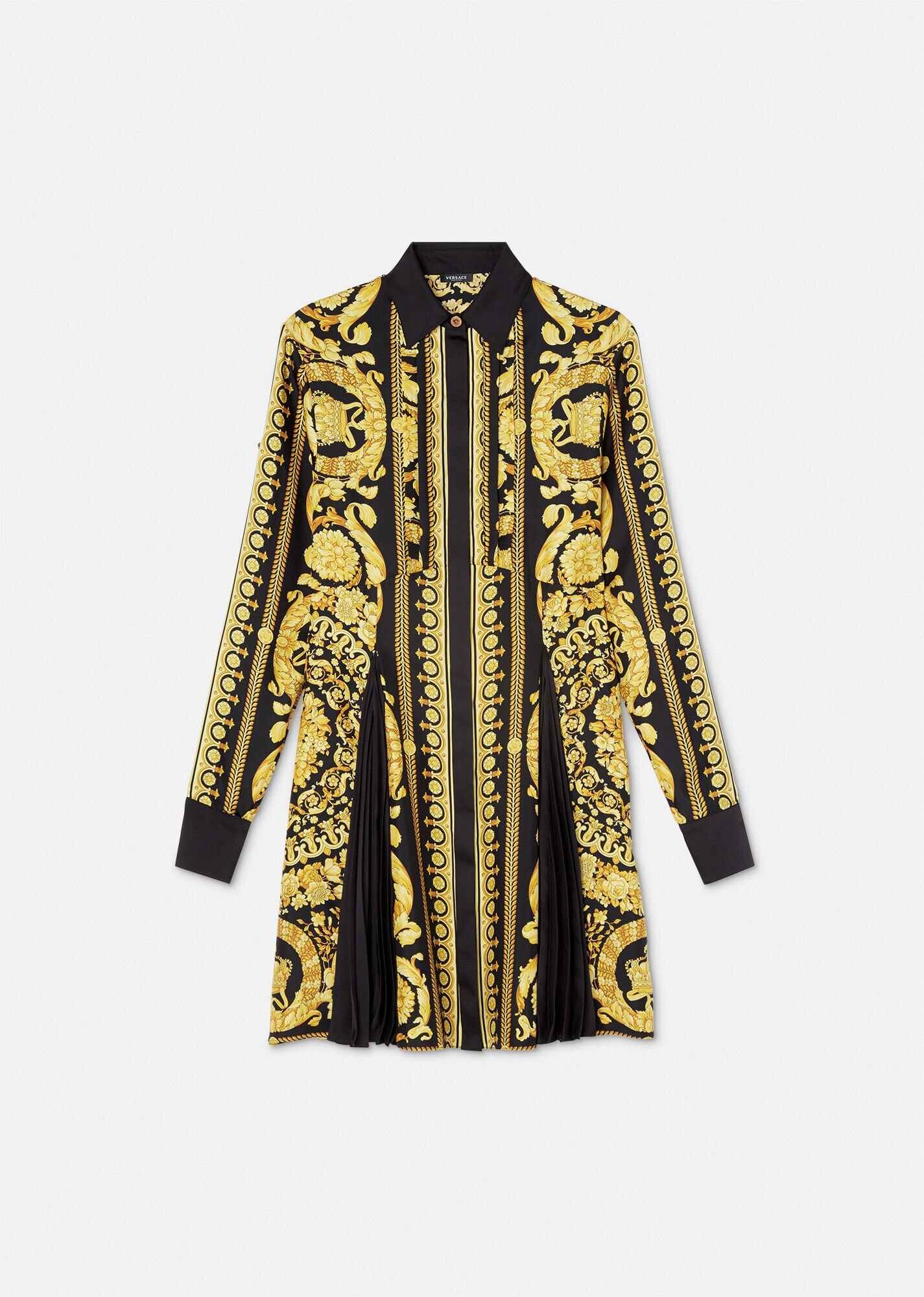 This midi shirt dress features Versace's signature Barocco print throughout - a recurring brand motif with architectural baroque patterns. The long-sleeved style is detailed with Medusa buttons and pleat inserts at the sides for added movement and flare. DETAILS & CARE - Barocco print - Medusa hardware - Long sleeves - Pointed collar - Concealed button placket - Pleat inserts - Outer fabric: 100% Silk - Cool iron - Delicate dry clean - Do not bleach - Do not tumble dry - Do not wash - Protect accessory before washing SIZE & FIT - All sizes fit Italian standards