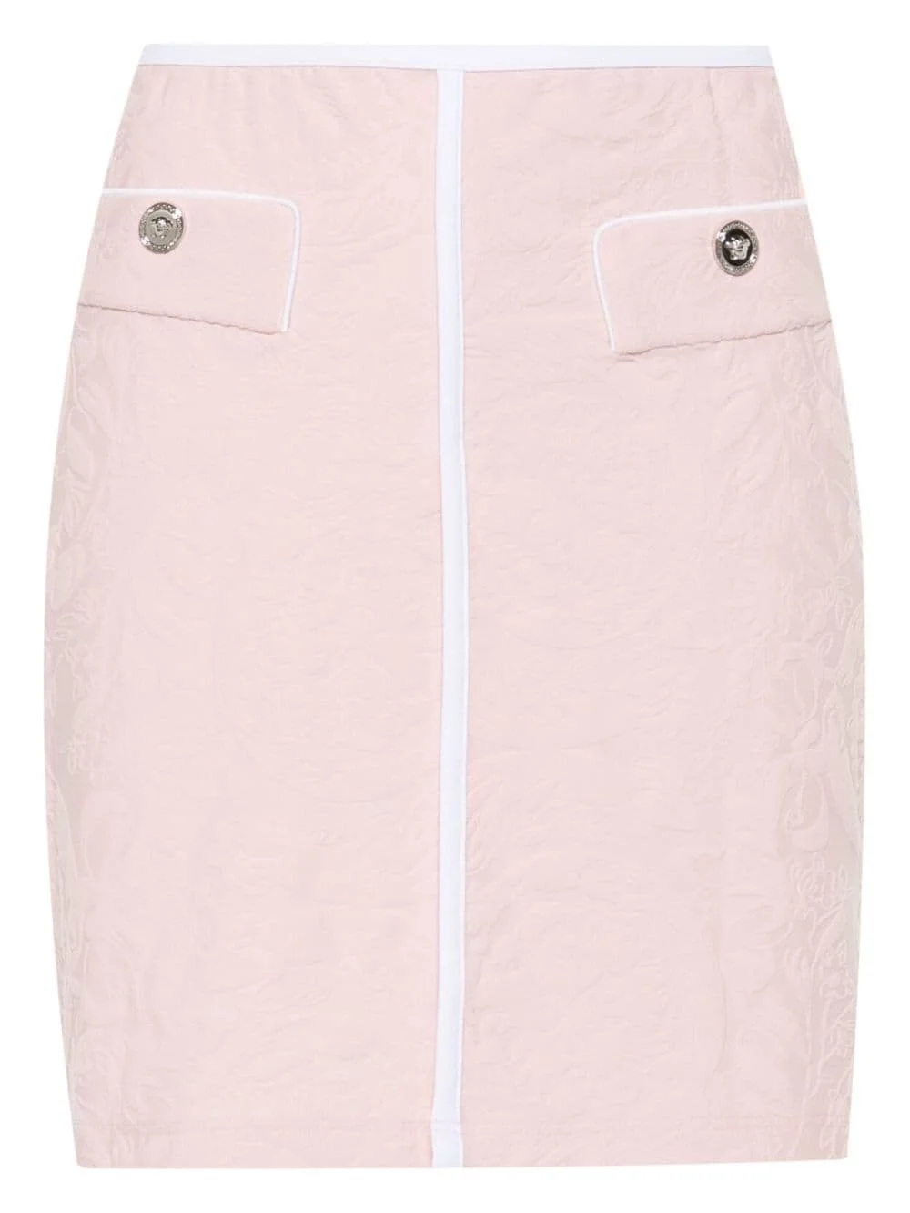 patterned-jacquard mini skirt Highlights - Pink - Stretch-design - Wrap design - Towelling finish - Baroque patterned jacquard - Contrasting trim - Two front patch pockets - Logo-embossed buttons - Thigh-length - Straight hem - Pull-on style Made in Italy Composition Polyamide 88%, Polyester 12% SIZE & FIT Measurement HIPS 35.43 in(90 cm) LENGTH 16.92 in(43 cm) WAIST 25.98 in(66 cm)