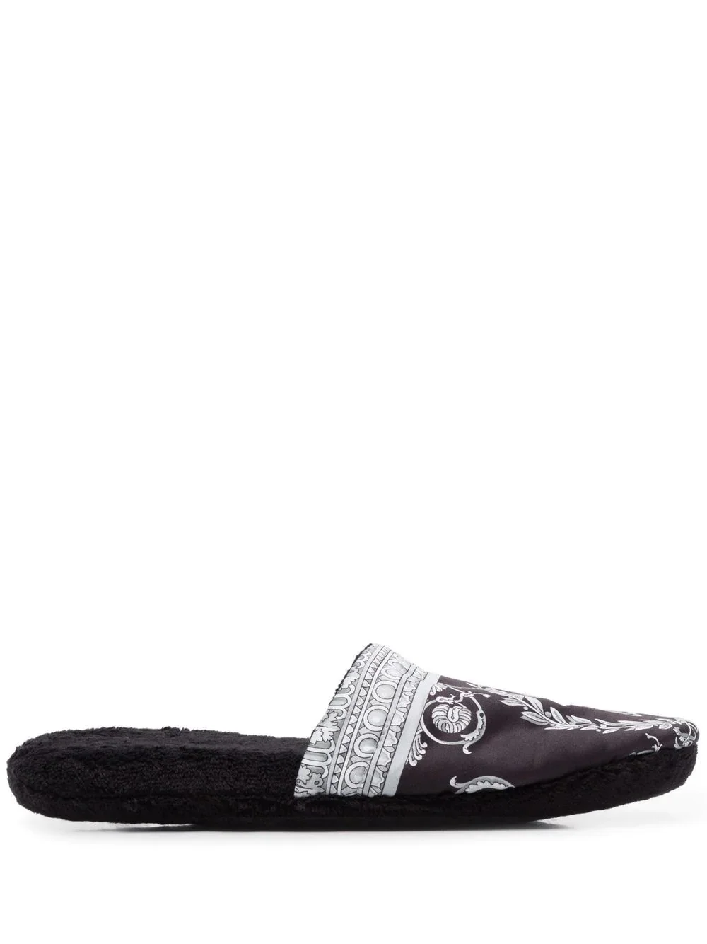 I Love Baroque slippers Versace's new I Baroque print merges two of the brand's Greek-inspired and most recognisable elements: the Barocco and the Medusa motifs. They appear in a silver-tone and black design to trim these cotton slippers. Highlights - Black/white - Cotton - Slip-on style - Medusa head motif - Baroque-pattern print - Round toe - Towelling lining - Flat sole Made in Italy Composition Outer: Cotton 100% Sole: Cotton 100% Lining: Polyurethane 100%