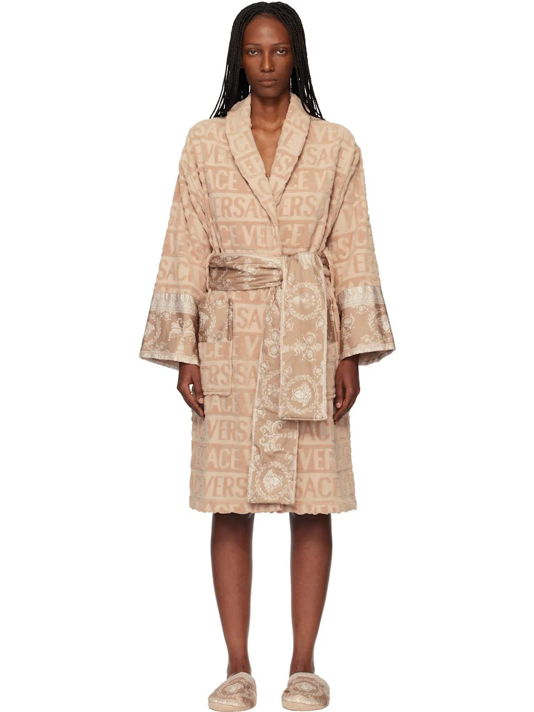 Cotton terrycloth bathrobe. · Jacquard logo pattern and Barocco poplin trim throughout · Shawl collar · Belt loops with detachable self-tie belt · Patch pockets at waist · Dropped shoulders Supplier color: Beige 100% cotton. Made in Italy 261404F077006