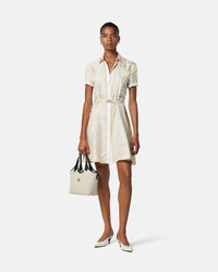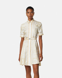 This short-sleeved mini shirt dress is crafted from silk twill and features a Barocco print, an accent Medusa button at the front closure, and a removable Medusa '95 belt at the waist. - Barocco print - Medusa hardware - Medusa '95 hardware - Short sleeves - Pointed collar - Concealed front button closure - Detachable waist belt - Outer composition: 100% Silk Size & Fit - The model is 5'10" / 1.79 m tall and wears size 38 IT Item: 1021009-1A15215_5Y570