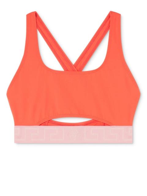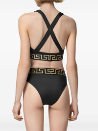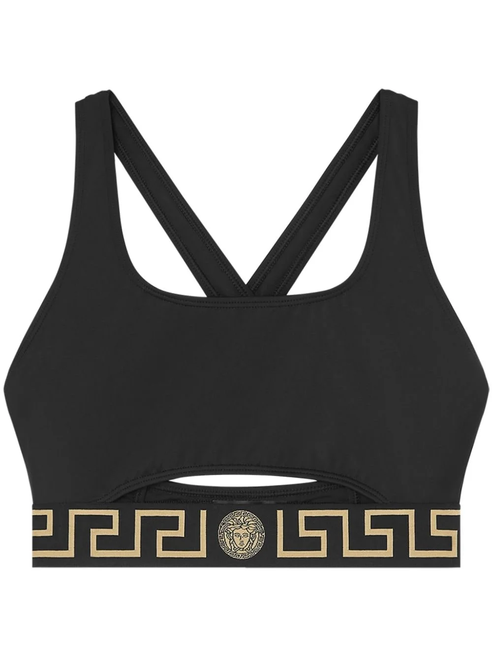 Greca Border bikini top Highlights - Black/gold-tone - Signature barocco print - Medusa head motif - Scoop neck - Cut-out detailing - Rear criss-cross straps - Be mindful to try on swimwear over your own garments. Made in Italy Composition Outer: Nylon 78%, Elastane 22% Lining: Nylon 78%, Elastane 22%