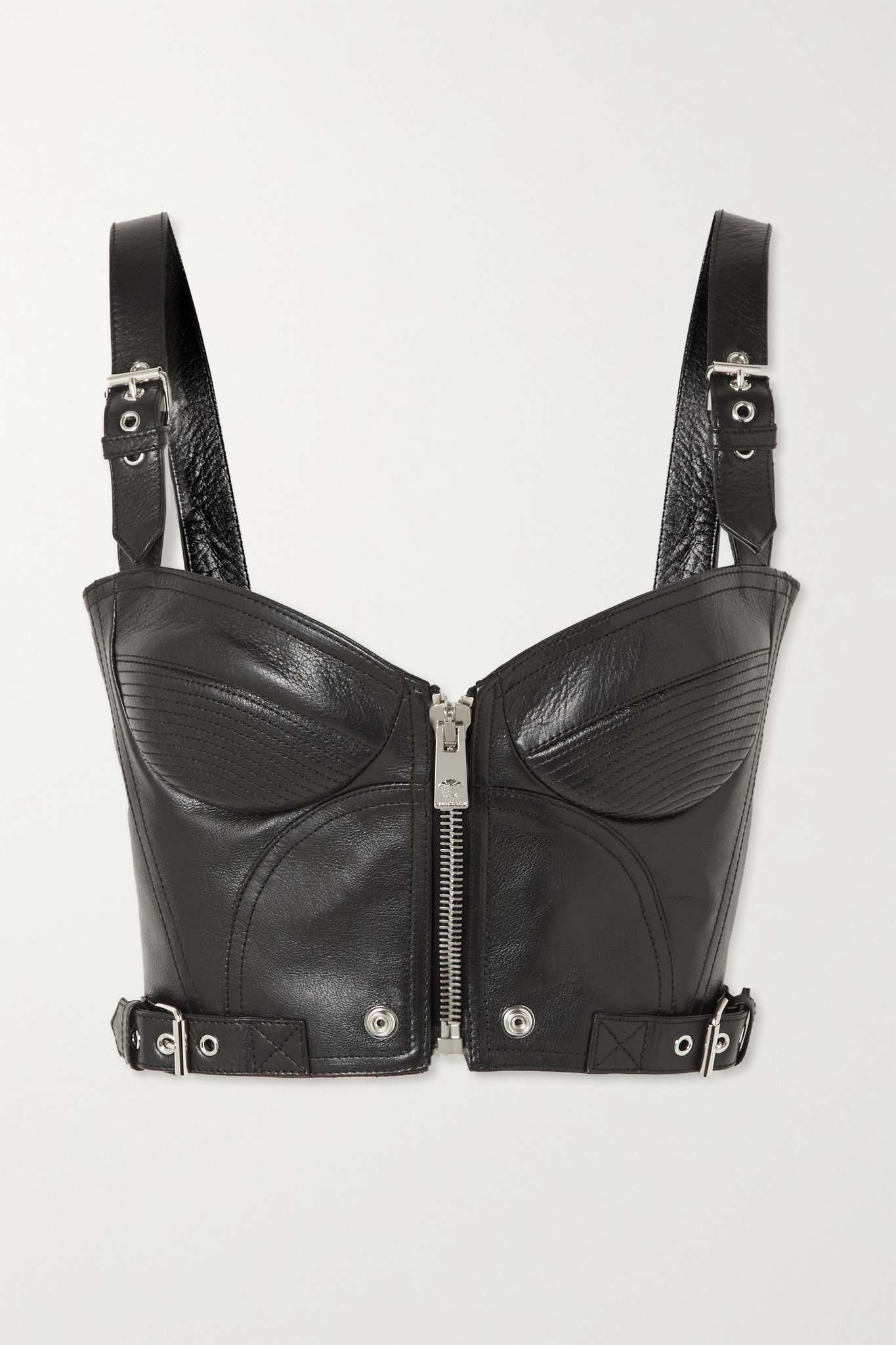 EDITORS'NOTES Inspired by the rebellious nature of biker jackets, Versace's bralette is made from thick textured-leather, though it feels supple, too. Fitted across the bust, with molded cups to define your shape, it's detailed with silver buckles at the waist and shoulder straps. The zipper is functional so you can experiment with layering. SIZE & FIT - Fits true to size, take your normal size - Designed for a slim fit - Cropped length - Supple, non-stretchy leather - Model is 175cm/ 5'9" and is wearing an IT 38 DETAILS & CARE - Black textured-leather - Zip fastening through front - 100% leather (Calf) - Specialist clean