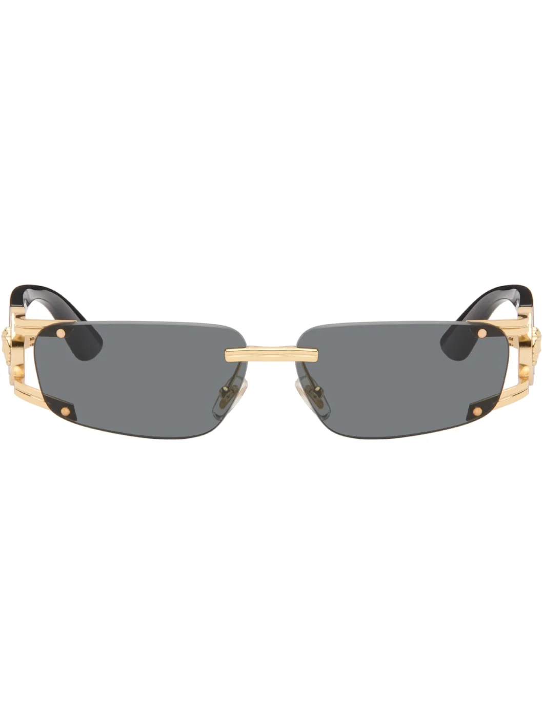 Rectangular rimless metal- and acetate-frame sunglasses. · Gray lenses · Adjustable rubber nose pads · Medusa hardware at temples · Includes case · Size: 59.13 115 Supplier color: Black/Gold Metal, acetate. Made in Italy 261404F005013