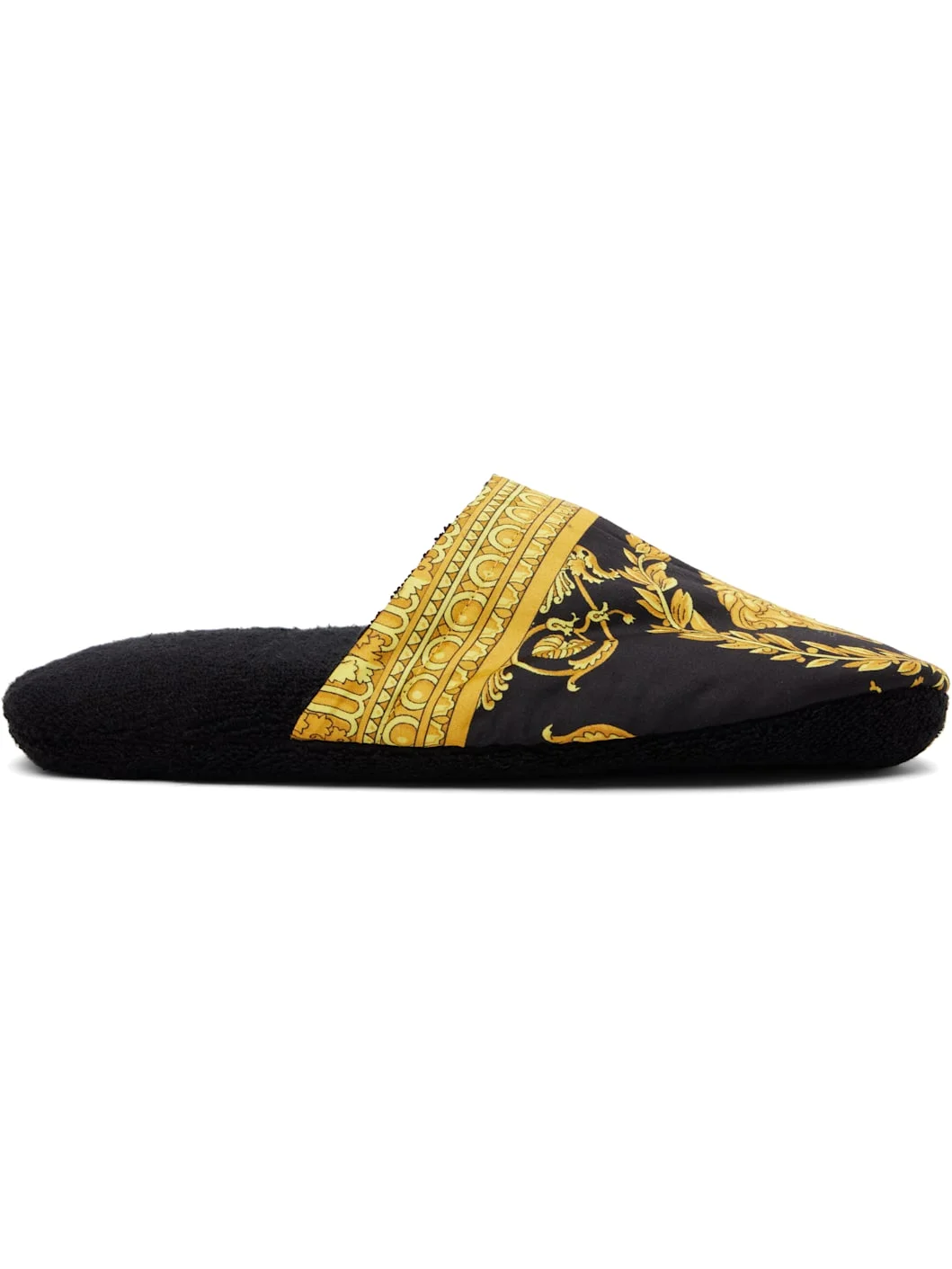 Cotton sateen slippers. · Baroque pattern printed throughout · Medusa printed at vamp · Terrycloth lining · Terrycloth sole Supplier color: Black/Gold Textile. Made in Italy 261404F121006